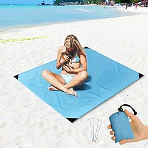 Beach Blanket Sand Proof and Waterproof Pocket Sized Picnic Mat 67″ X 55″ – Quick Drying Nylon – Best Outdoor Beach Mat for Camping, Travel, Hiking, Festival and Sports – 4 Ground Stakes Included
